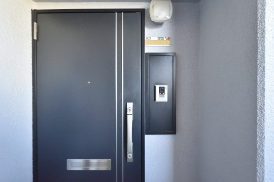 ダブルロックの玄関ドアとカメラ付きインターフォン。