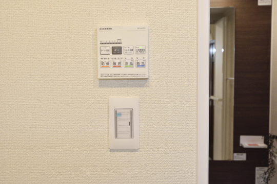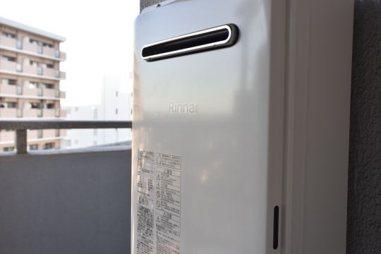 北向きバルコニーに給湯器が設置されています。2025年8月製の給湯器です。