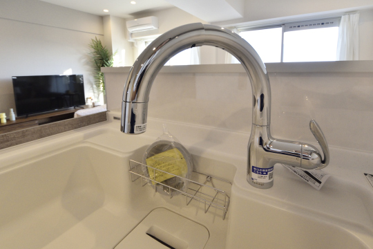 お掃除ラクラク水栓。水垢が発生しにくいのでお掃除はサッと拭くだけ。