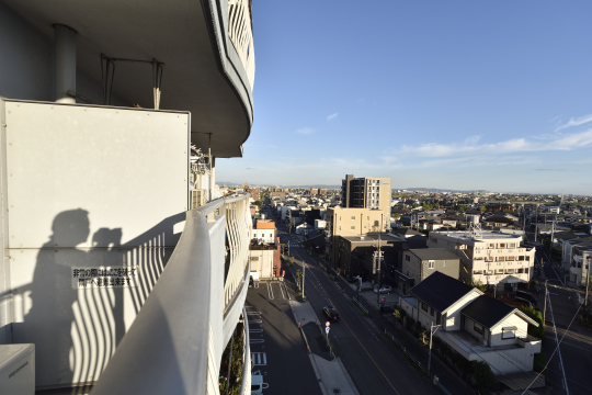 西バルコニーから眺める名鉄三河線「刈谷市」駅とソシアルセイワ刈谷。