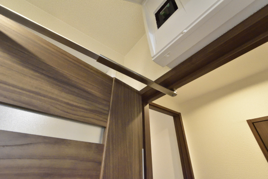 建具に取り付けられたドアクローザー。風でドアがバタンと閉じないようにするための金具です。