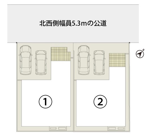 北西側幅員5.3mの公道。交通量少なめの閑静な住宅街です。