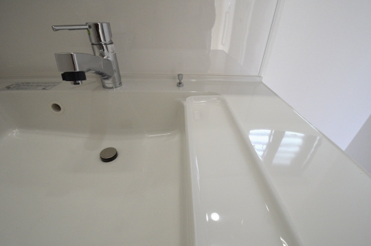 【洗面室】ホワイトでまとめられた清潔感ある洗面室。ゆとりある広さ。