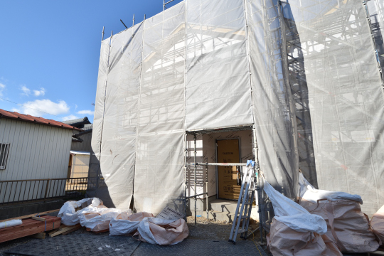 1月6日現在、外壁工事中。透湿防水シートが施工されました。ベタ基礎に基礎パッキンを配し、壁倍率5倍の壁パネルを諸所に配した通気工法です。