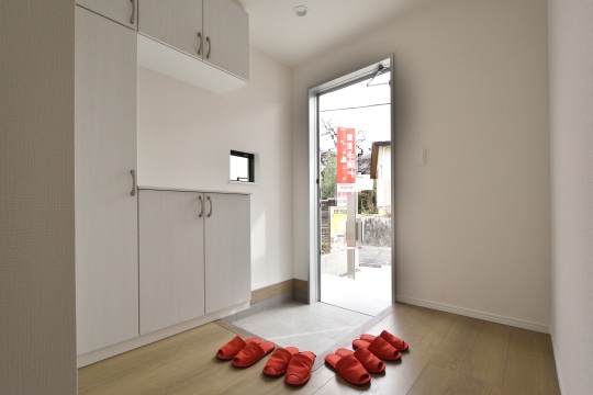 家族が同時に出入りしやすい、ゆとりのある玄関がお出迎え。コの字型のシューズボックスがあり、家族の靴をスッキリ収納できます。