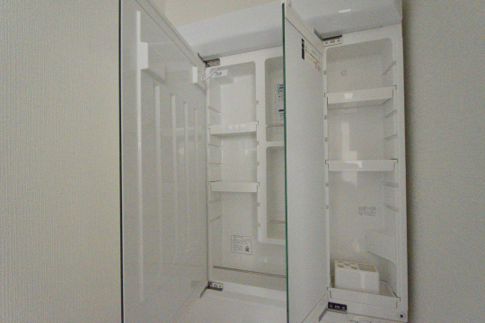 家族の身支度アイテムをスッキリ収納できる三面鏡。