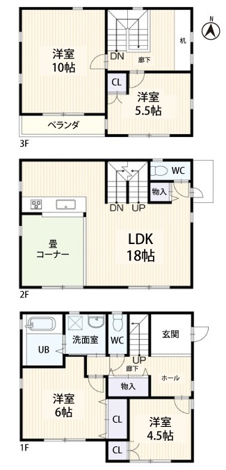 間取り4LDK、3階建の中古戸建です。