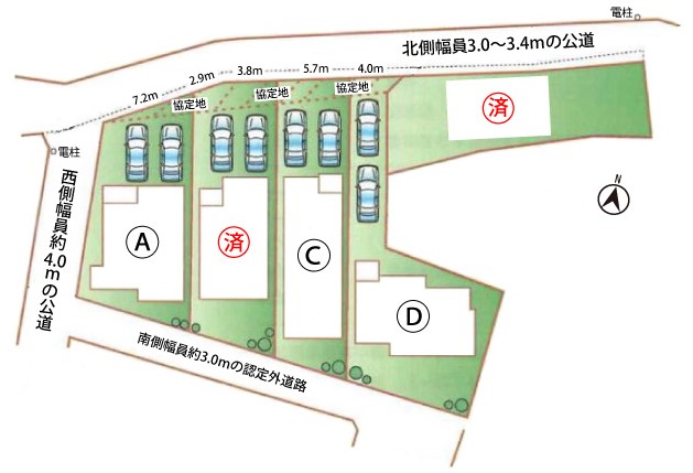接道状況 北側幅員約3.0~3.4mの公道(セットバック有り)、西側幅員約4.0mの公道に接面