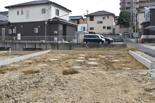 10月27日現在、地盤改良工事が完了。地盤調査の結果をもとに、補強の杭を打ち込むなどのその土地に適した地盤改良工事を行い、地盤に対する安全性を高めます。