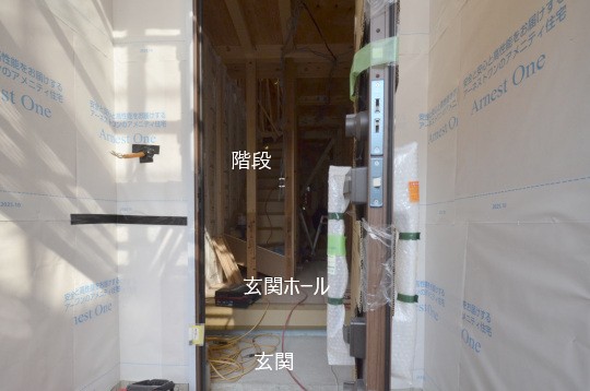 玄関から室内の様子を見せて頂きました。階段は、室内の木工事の中では比較的早い段階に行われます。工事が進みましたら、詳細お伝えします。