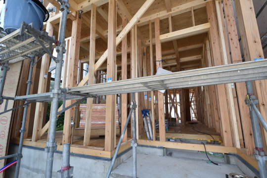 土台、柱、梁などの住宅の骨格を木の軸で造る木造在来軸組工法です。接合部には補強金物を取り付け、強い耐震性・耐久性を発揮します。