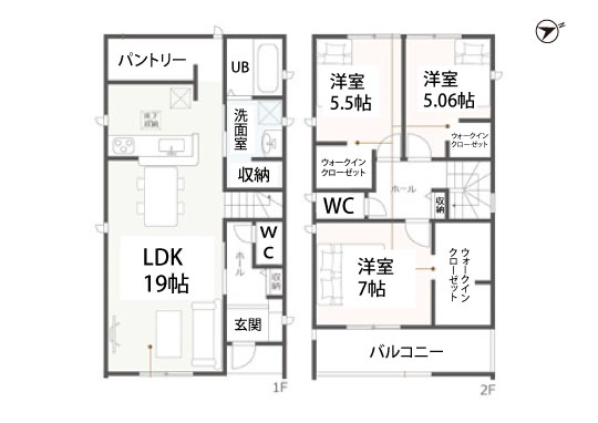 碧南市沢渡町【全5棟】2号棟の間取りは、3LDK+W.I.C。食品などのストックに便利なパントリー付です。