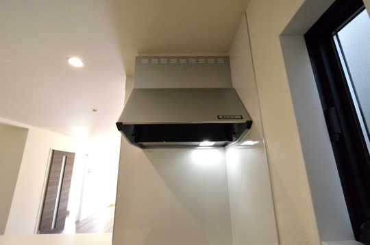 ライト付レンジフード。弱・強の2段階。手元が明るいので料理がしやすいですよ。スッキリデザインのダウンライト。