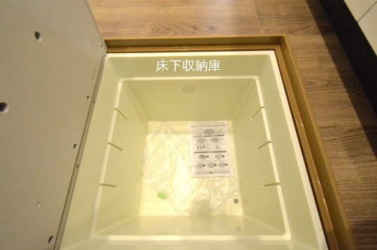 キッチンの床下収納庫を開けました。点検口を兼ねており、水漏れなどのトラブルがあった時に素早く対応できます。