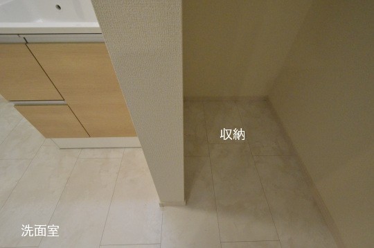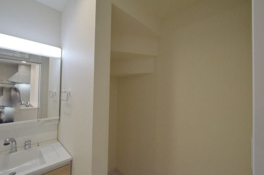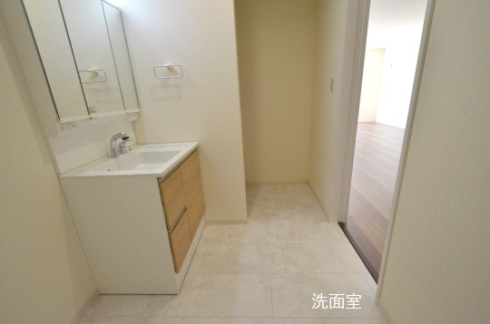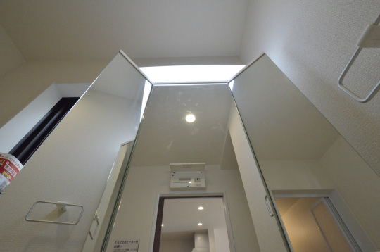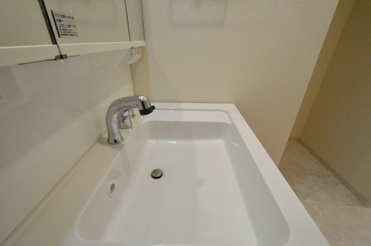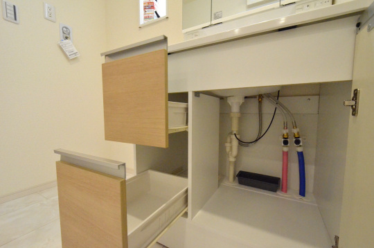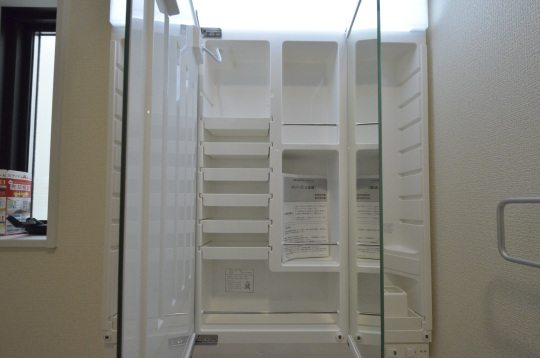 【洗面室】清潔感ある洗面室でございます。洗面まわりの空間を常にすっきりきれいが可能になりました。
