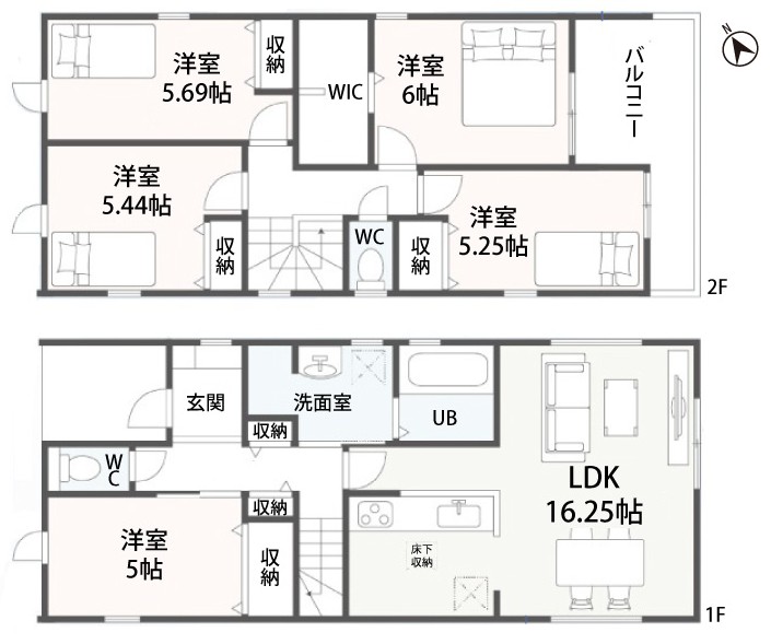 1号棟の間取りは5LDK+WIC。主寝室のウォークインクローゼットはたっぷり大容量で収納便利です。