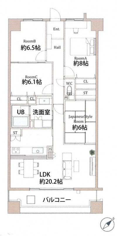| 専有面積 | 100.08㎡(約30.27坪) | バルコニー | 壁芯14.04㎡(約4.24坪) |