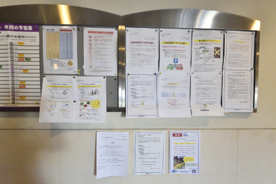 掲示板。(駐車場についての掲示が多い印象)ご内覧時にご確認くださいませ。
