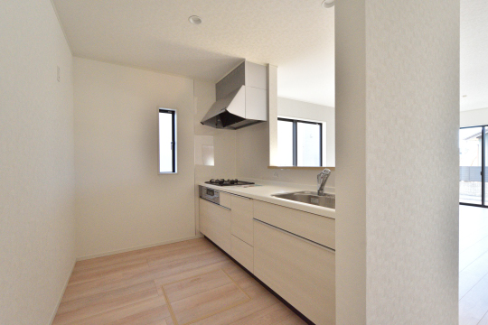 システムキッチンはファーストプラス製。家事をしながら、家族と話す・つながる・見守ることができる対面式キッチンです。