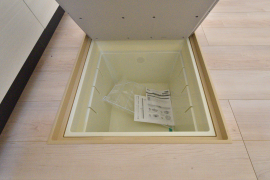キッチンに床下点検口が設けられています。定期的なメンテナンスや、万が一のトラブルに対応しやすい造りです。