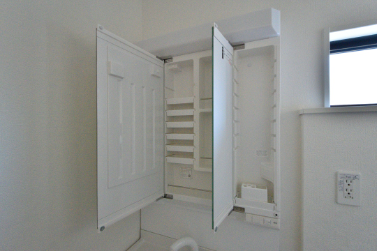 家族の身支度アイテムをスッキリ収納できる三面鏡。