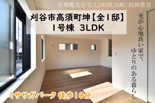 ★刈谷市高須町坤【全1邸】1号棟ページへようこそ!長い間安心して快適に住むことができる長期優良住宅です。明るく広々としたLDK20.25帖でゆったりとお寛ぎいただけます。