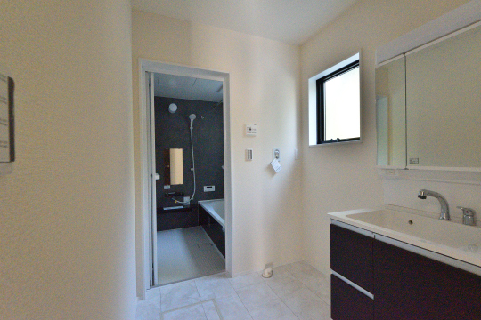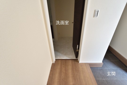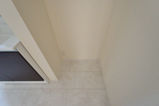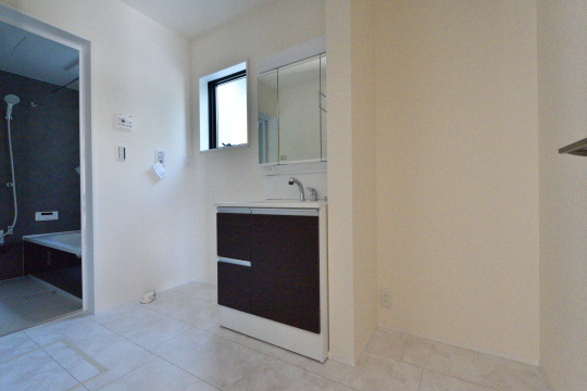 洗面化粧台横のスペースには収納ラックなどを置けそうです。