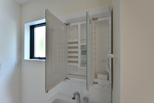 家族の身支度アイテムをスッキリ収納できる三面鏡。
