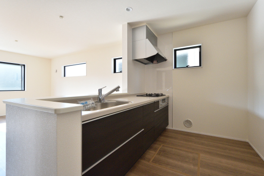 システムキッチンはファーストプラス製。家事をしながら、家族と話す・つながる・見守ることができる対面式キッチンです。