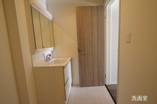 【洗面室】清潔感ある洗面室でございます。洗面まわりの空間を常にすっきりきれいが可能になりました。