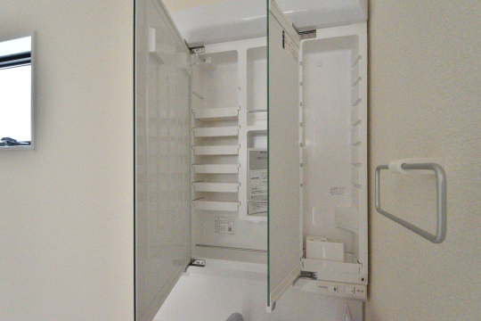 家族の身支度アイテムをスッキリ収納できる三面鏡。