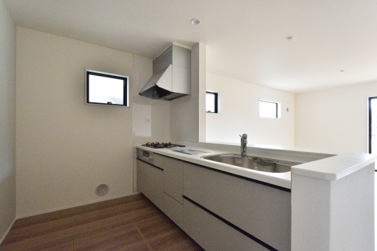 システムキッチンはファーストプラス製。家事をしながら、家族と話す・つながる・見守ることができる対面式キッチンです。