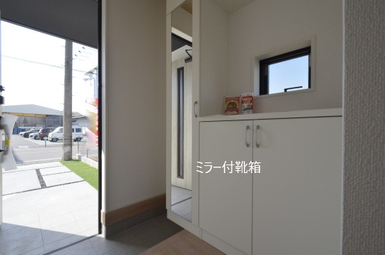 室内の様子お伝えします。1号棟の間取りは3(4)LDK+パントリー付。日々の暮らしが楽しくなる家。玄関にはミラー付の靴箱。