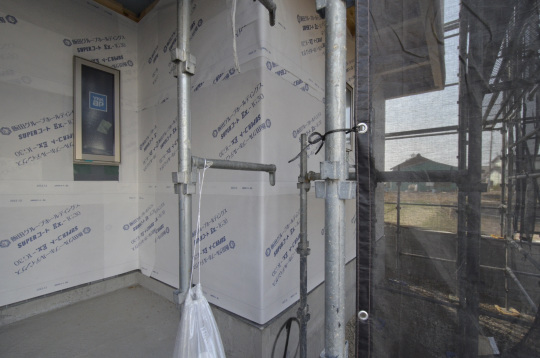 白いシートは、透湿防水シート。透湿防水シートとは、水は通さずに湿気(水蒸気)だけを通す性質をもつ薄いシートのことで、建物を雨から守ったり、壁内(柱の厚み分の空間)の結露を防ぐ効果があります。