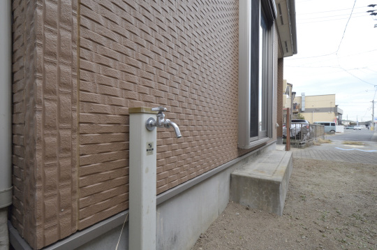 立水栓。花の水遣りや、泥付きのモノも気軽に洗う事ができます。